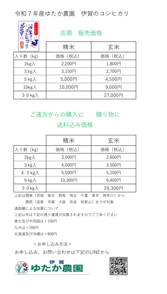 店頭価格 送料込価格 <ご注文方法> 令和7年産 お米 送料込み注文用紙 「送料込価格」のご注文用紙はコチラからプリントアウトしてご記入の上、LINEにてお申込みください ご不明な点、お問い合わせは「ゆたか農園 公式LINE」から